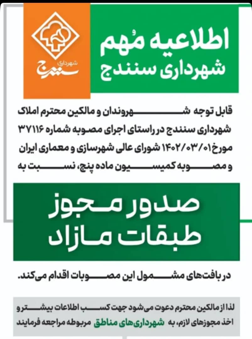 شهرداری سنندج در راستای اجرای مصوبه شماره ۳۷۱۱۶ مورخ ۱۴۰۲/۰۳/۰۱ شورای عالی شهرسازی و معماری ایران و مصوبه کمیسیون ماده پنج نسبت به صدور مجوز طبقات مازاد در بافتهای مشمول این مصوبات اقدام مینماید.