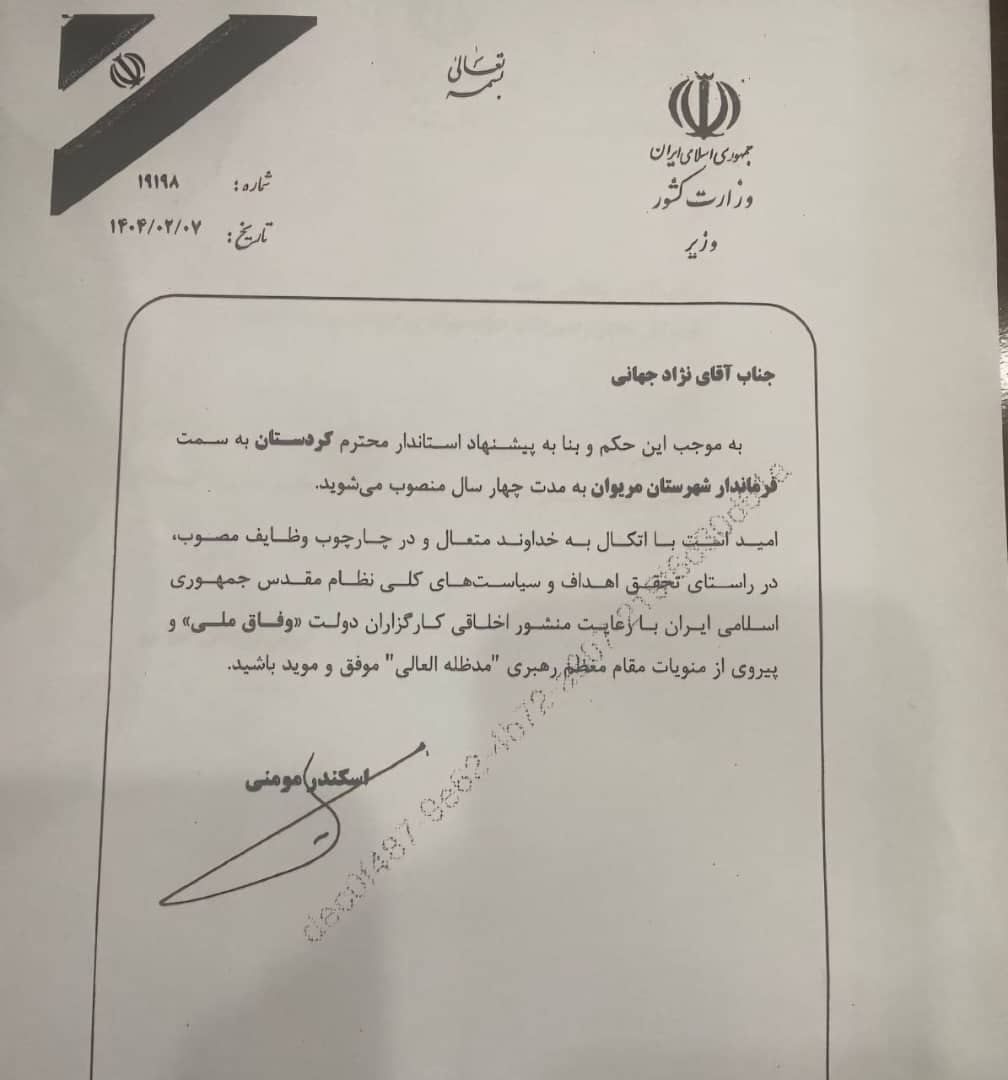با پیشنهاد استاندار کردستان و با حکم وزیر کشور، مهندس #نژاد_جهانی به عنوان فرماندار شهرستان مریوان منصوب شد.