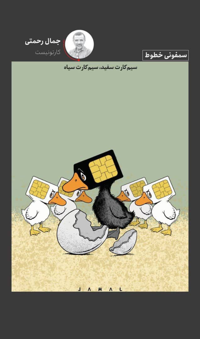 کاریکاتور جمال رحمتی به موضوع سیمکارتهای سفید و سیاه و فیلترینگ اشاره دارد.