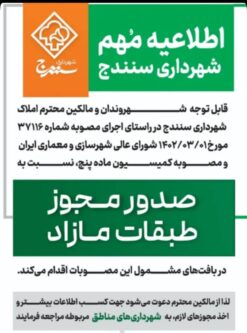 به اطلاع شهروندان و مالکان محترم املاک سطح شهر میرساند: شهرداری سنندج در راستای اجرای مصوبه شماره ۳۷۱۱۶ مورخ ۱۴۰۲/۰۳/۰۱ شورای عالی شهرسازی و معماری