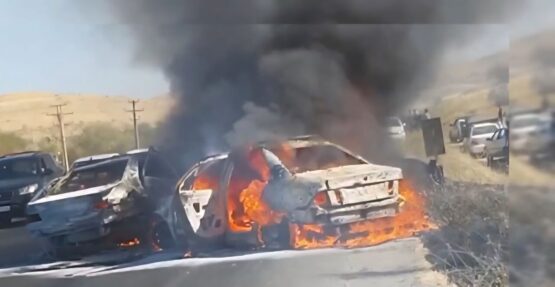 آتشسوزی بر اثر تصادف زنجیرهای در محور سقز-بوکان/ یک فوتی و هشت مصدوم+فیلم